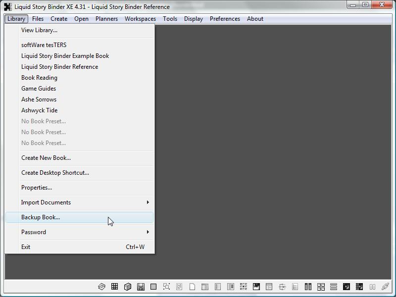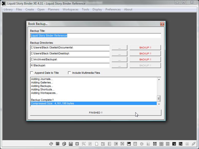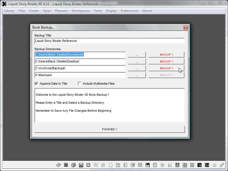 With Liquid Story Binder, it is possible to backup the entire contents of an opened book, with all its chapters, notes, backups, outlines, and images with just a few easy clicks of the mouse.