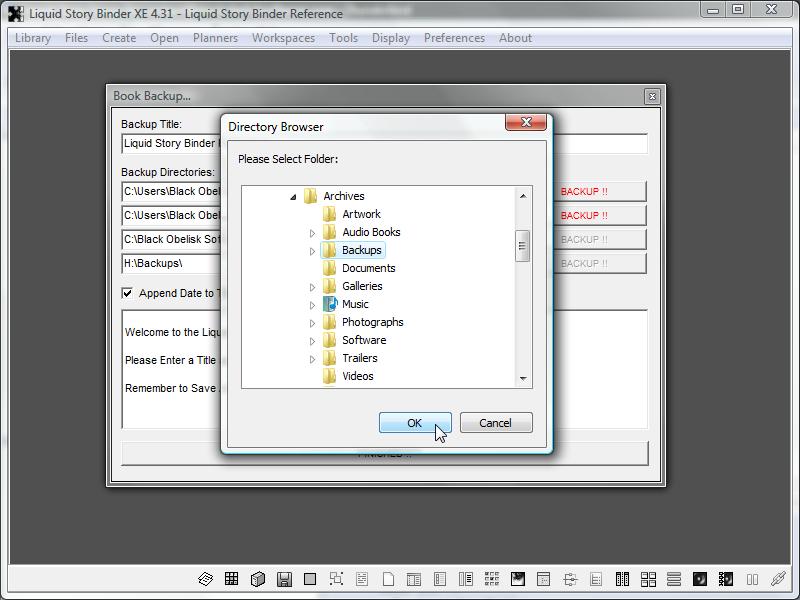 The 'Book Backup' dialog compresses all your files into a single, convenient ZIP file, accessible outside of the Liquid Story Binder XE environment.