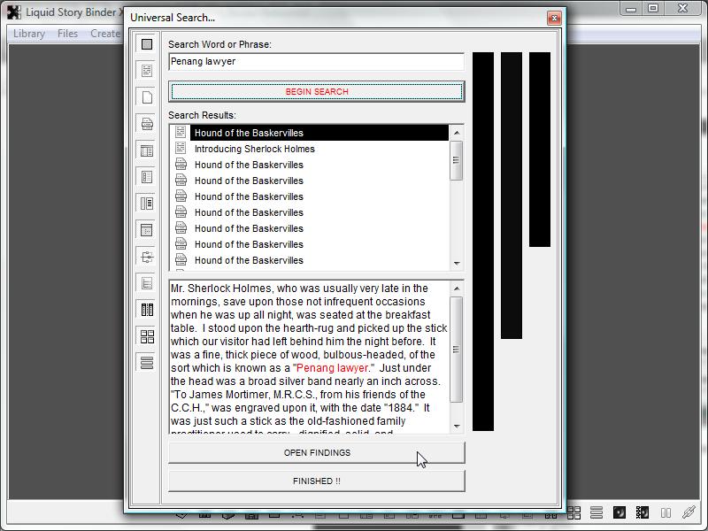 Liquid Story Binder's 'Universal Search' allows you to search every file within the selected book. Here, you can search your chapters, notes and backups for any given word, words, or phrase.