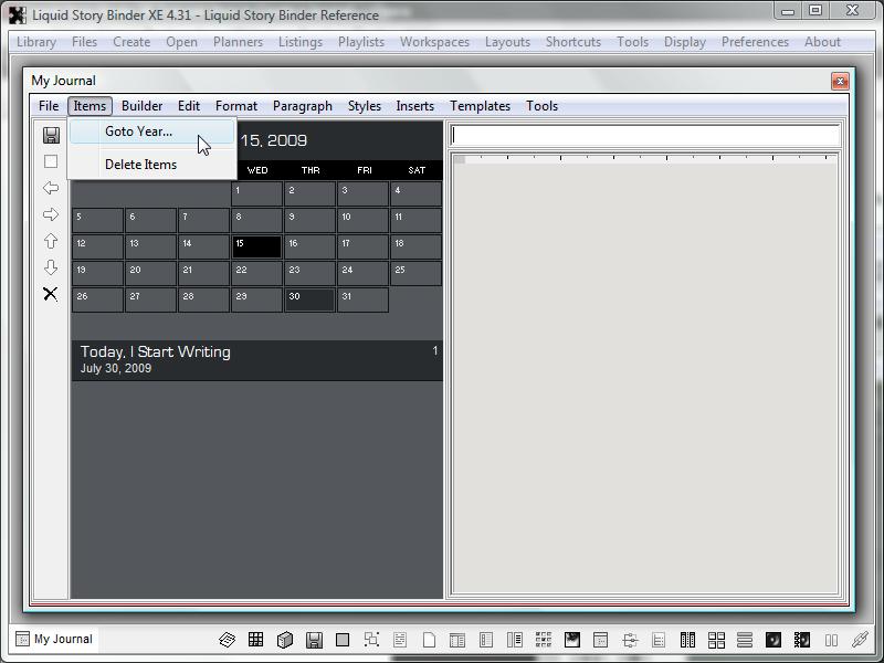Use the Journal's toolbar to quickly jump to today, back one month, forward one month, back one year, and forward one year. Select a specific day using the Journal calendar.
