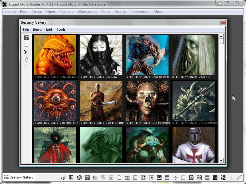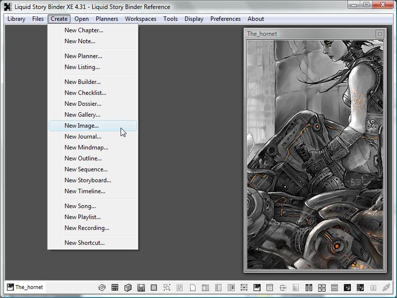 You may add an unlimited number of reference images to help with your writing experience. To add a new image, simply click 'New Image...' from the 'Create' menu. Select an appropriate image file, and it will be copied to your book directory, allowing you instant access to it whenever you work.