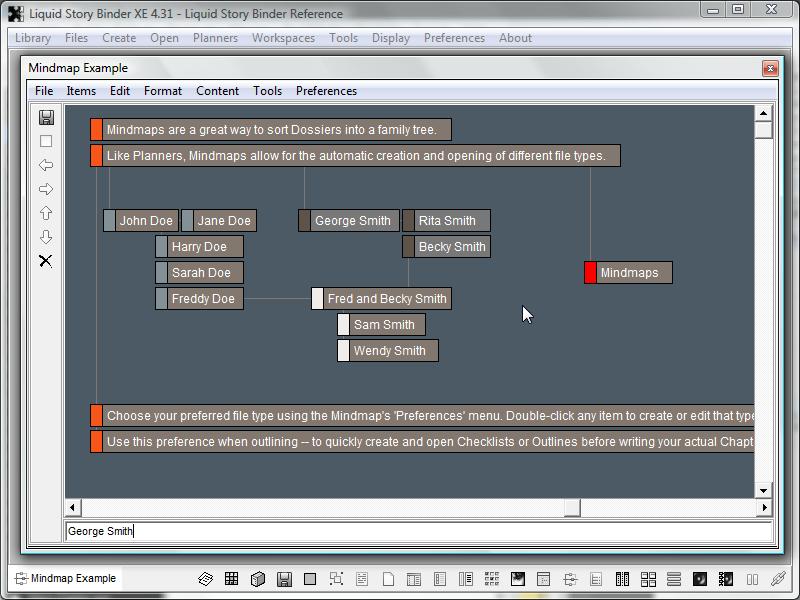 Liquid Story Binder XE Mindmaps allow you to visually link ideas together using lines and text. A mindmap is a diagram used to represent words, ideas, tasks, or other items linked to and arranged around a central key word or idea. Unlike many mindmapping applications, Liquid Story Binder XE does not use a rigid or pre-designed structure. Users can place items however they choose. Create item colonies, isolated from one another. Index items by color. Change item connections quickly and easily. Try using Mindmaps to create and organize family trees.