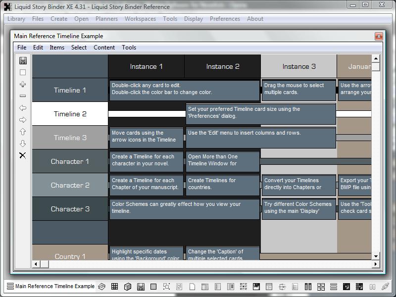 Liquid Story Binder allows you to quickly arrange ideas along multiple colored timelines, using individual text-based cards.