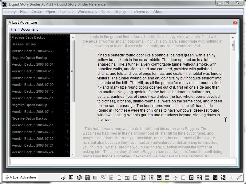 For every Chapter file, Liquid Story Binder XE creates a Backup file. In many ways, this Backup file resembles a Builder. Entries, exact copies of the Chapter, are created, given a title, and added to the Backup. An entry is created for each version or daily change. Listed at the top of the Backup listing are entries for a 'Session Backup' and 'Previous Save Backup'. A session entry is created, just prior to saving, each time XE is closed and then re-opened. An entry is also created every time you say 'No' to saving. This entry is entitled a 'Negative Option Backup'.