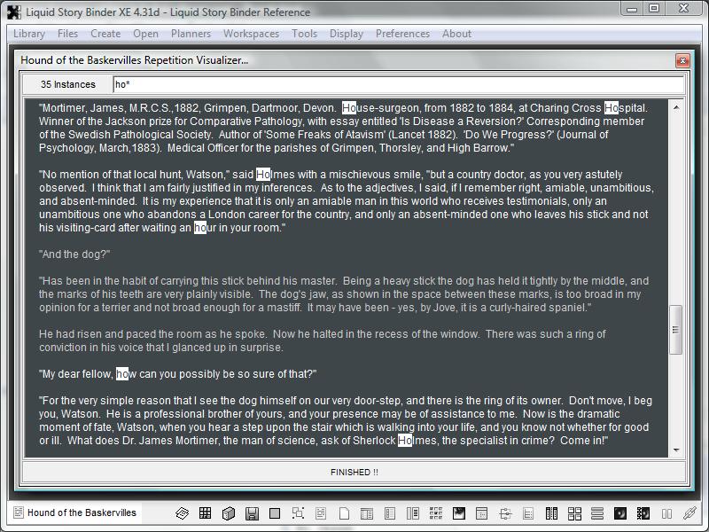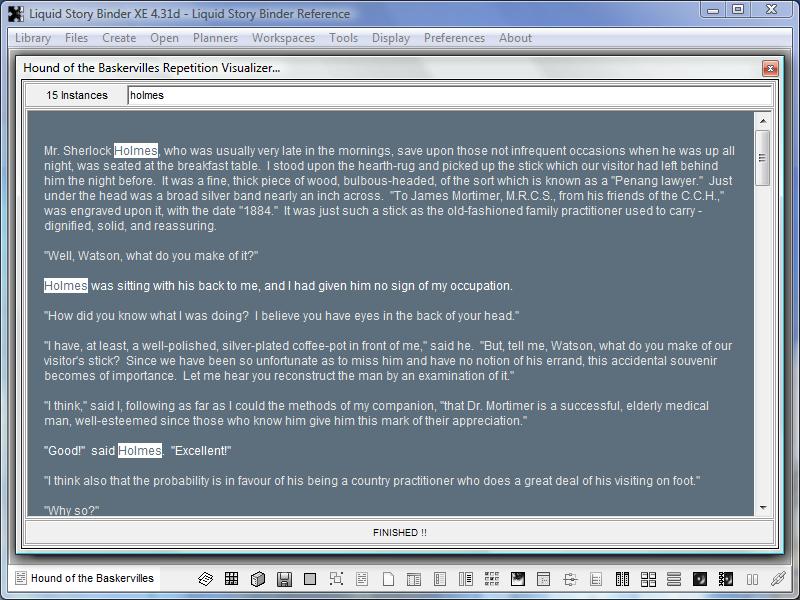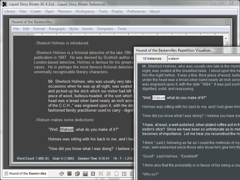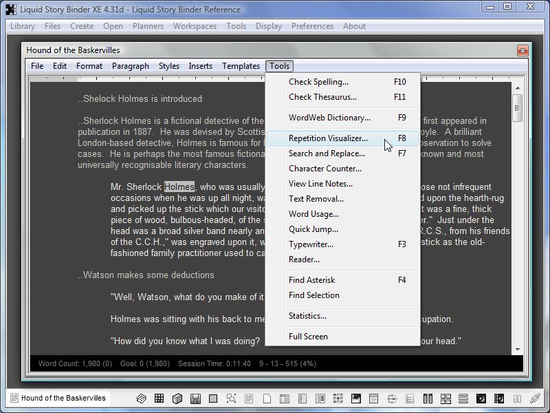 Liquid Story Binder's Repetition Visualizer allows writers to quickly view and tally individual word instances.
