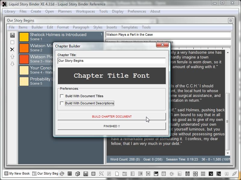 The Builder combines its various scenes into a single Chapter document ready for further editing, printing and Manuscript Building.