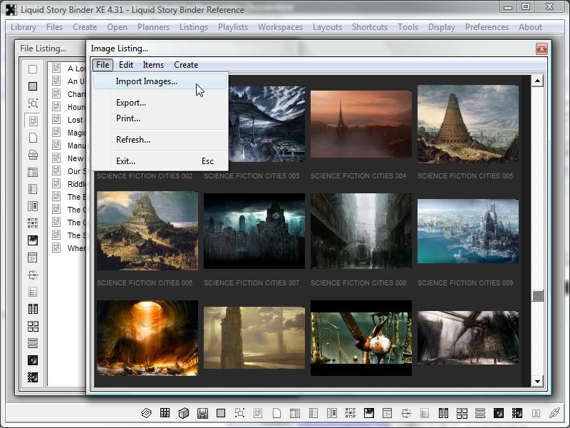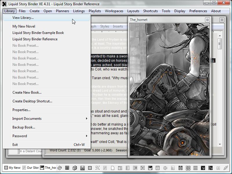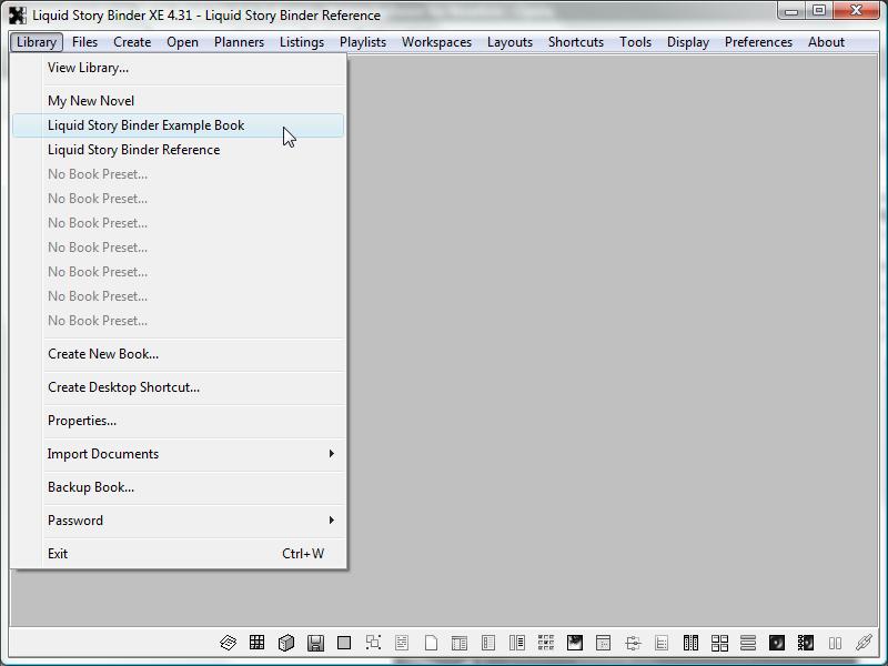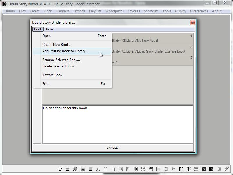 The 'Library' menu deals with Books. Think of a Liquid Story Binder XE 'Book' as a project or file folder -- the place where all your different files are located.